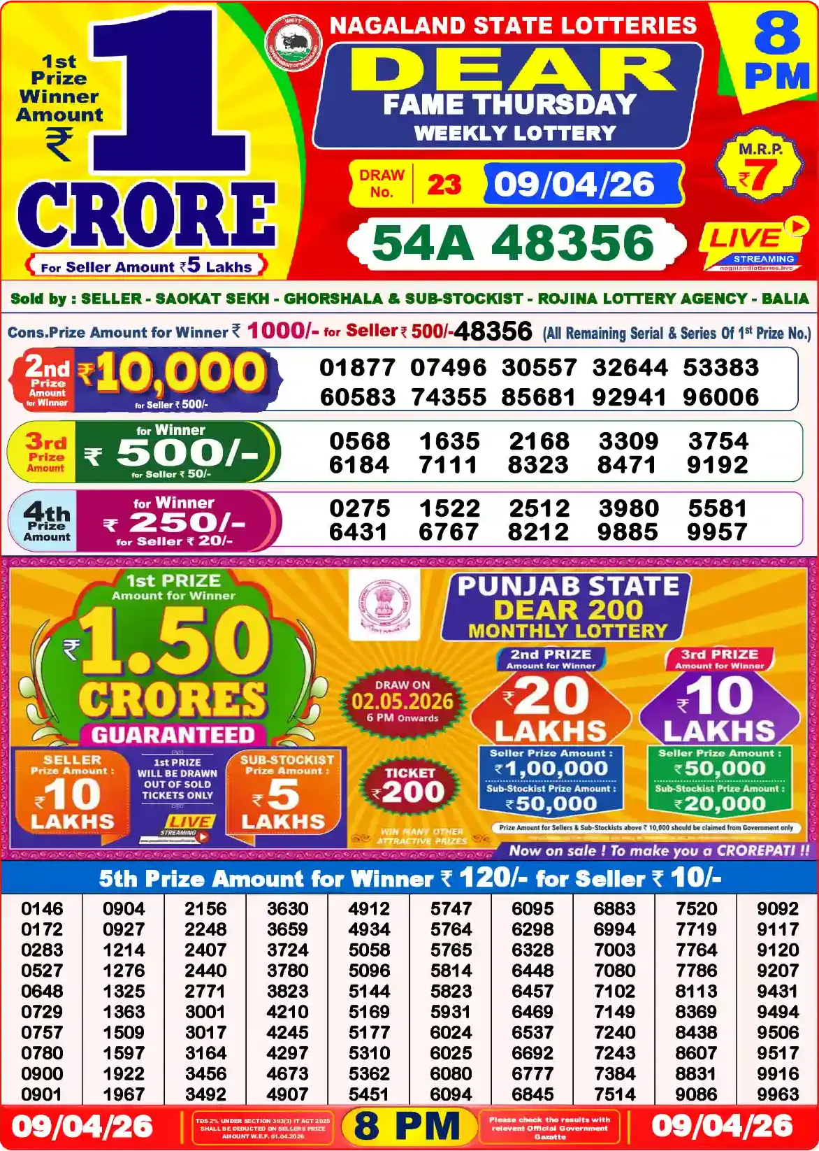 DEAR LOTTERYThe Nagaland Lottery Result will be announced yesterday 09/04/2026 at 8:00 p.m., and participants can check the winning numbers online on our website. The Nagaland State Lottery Sambad Today 8pm is the third of three daily draws.