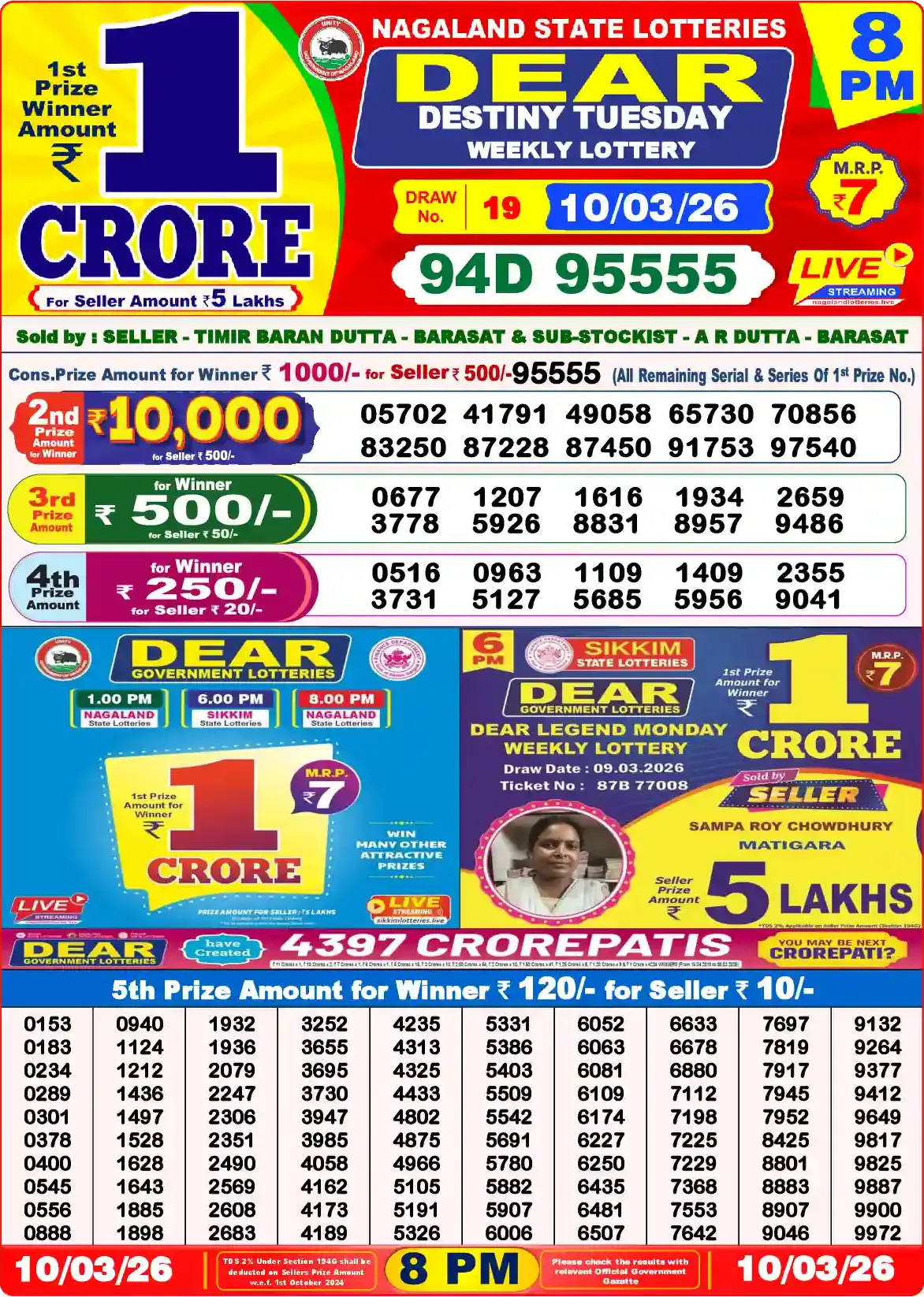 Dear Lottery results yesterday 10/03/2026 from the state of Nagaland at 8:00 p.m. View the Dear Lottery Result Today 8 PM on our website.