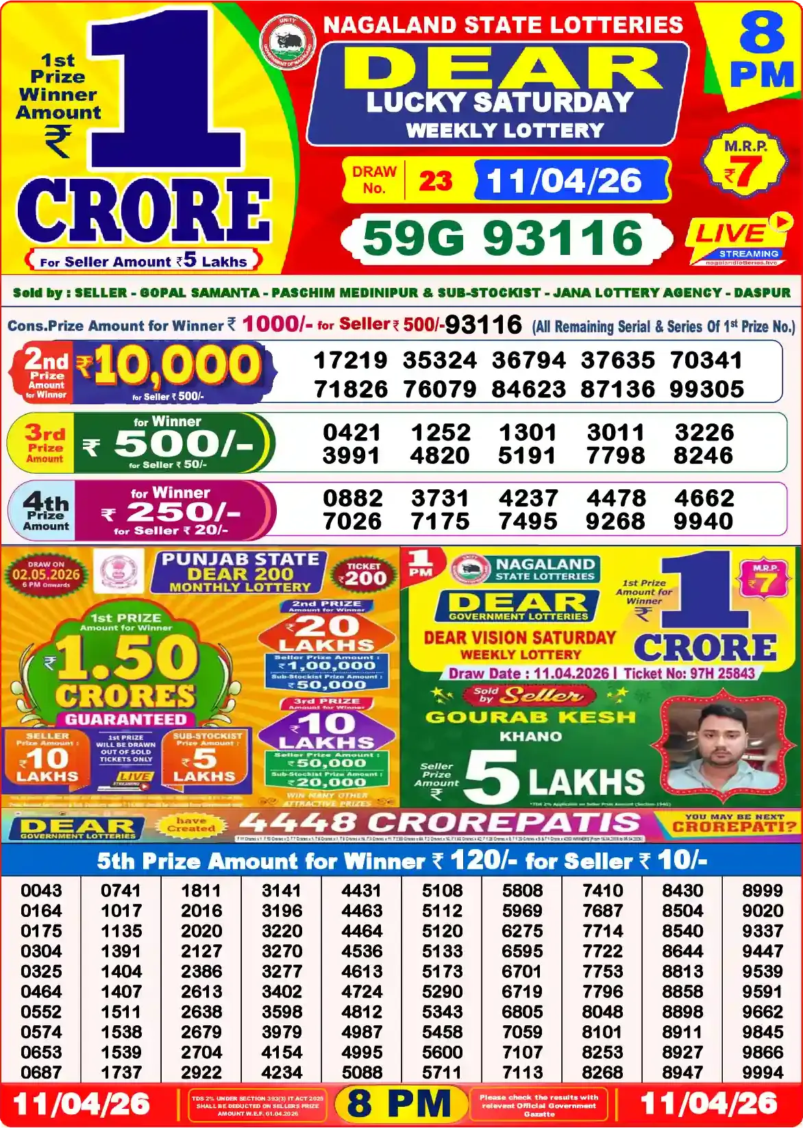 Dear Lottery results yesterday 11/04/2026 from the state of Nagaland at 8:00 p.m. View the Dear Lottery Result Today 8 PM on our website.