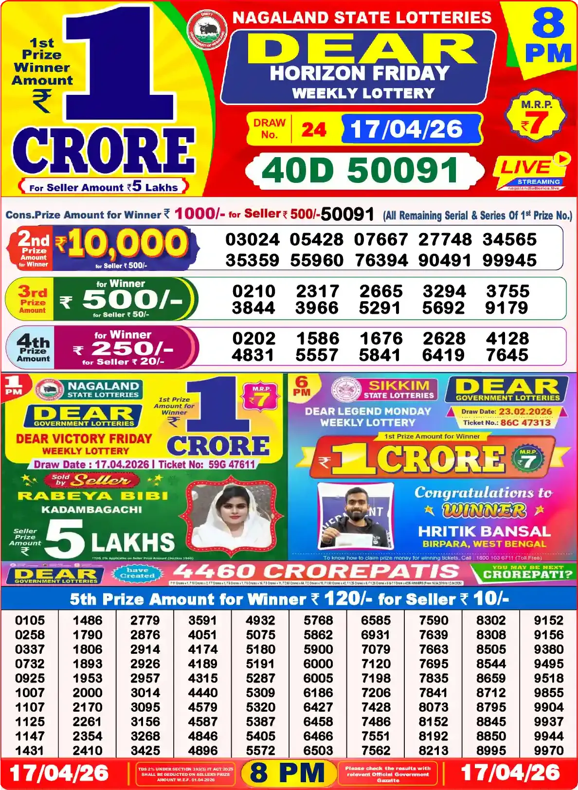 Dear Lottery results yesterday 17/04/2026 from the state of Nagaland at 8:00 p.m. View the Dear Lottery Result Today 8 PM on our website.