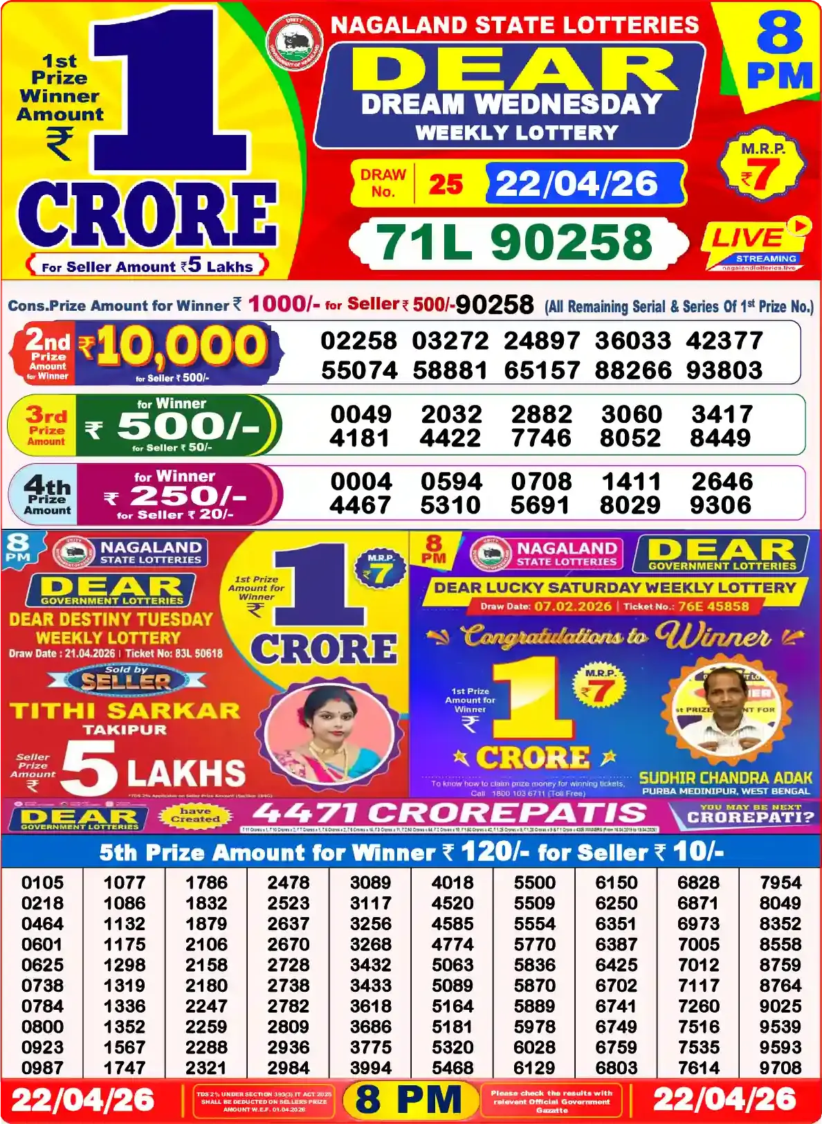 DEAR LOTTERYThe Nagaland Lottery Result will be announced yesterday 22/04/2026 at 8:00 p.m., and participants can check the winning numbers online on our website. The Nagaland State Lottery Sambad Today 8pm is the third of three daily draws.