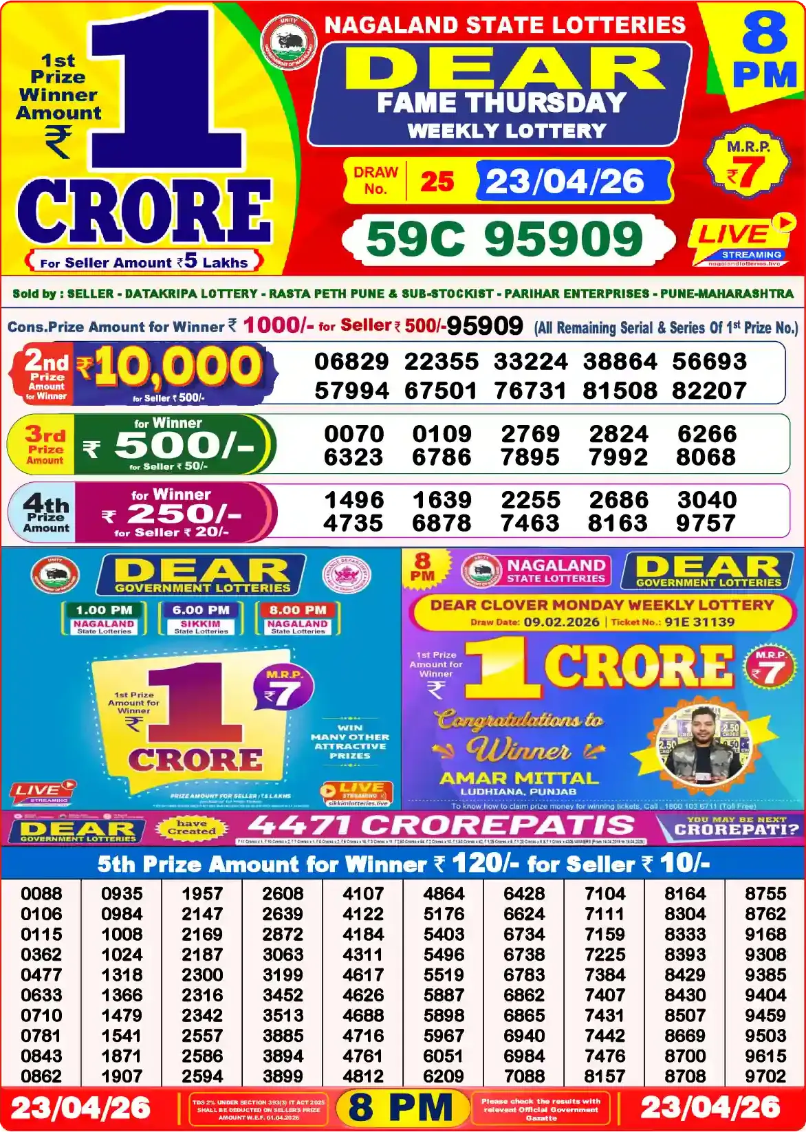 Dear Lottery results yesterday 23/04/2026 from the state of Nagaland at 8:00 p.m. View the Dear Lottery Result Today 8 PM on our website.
