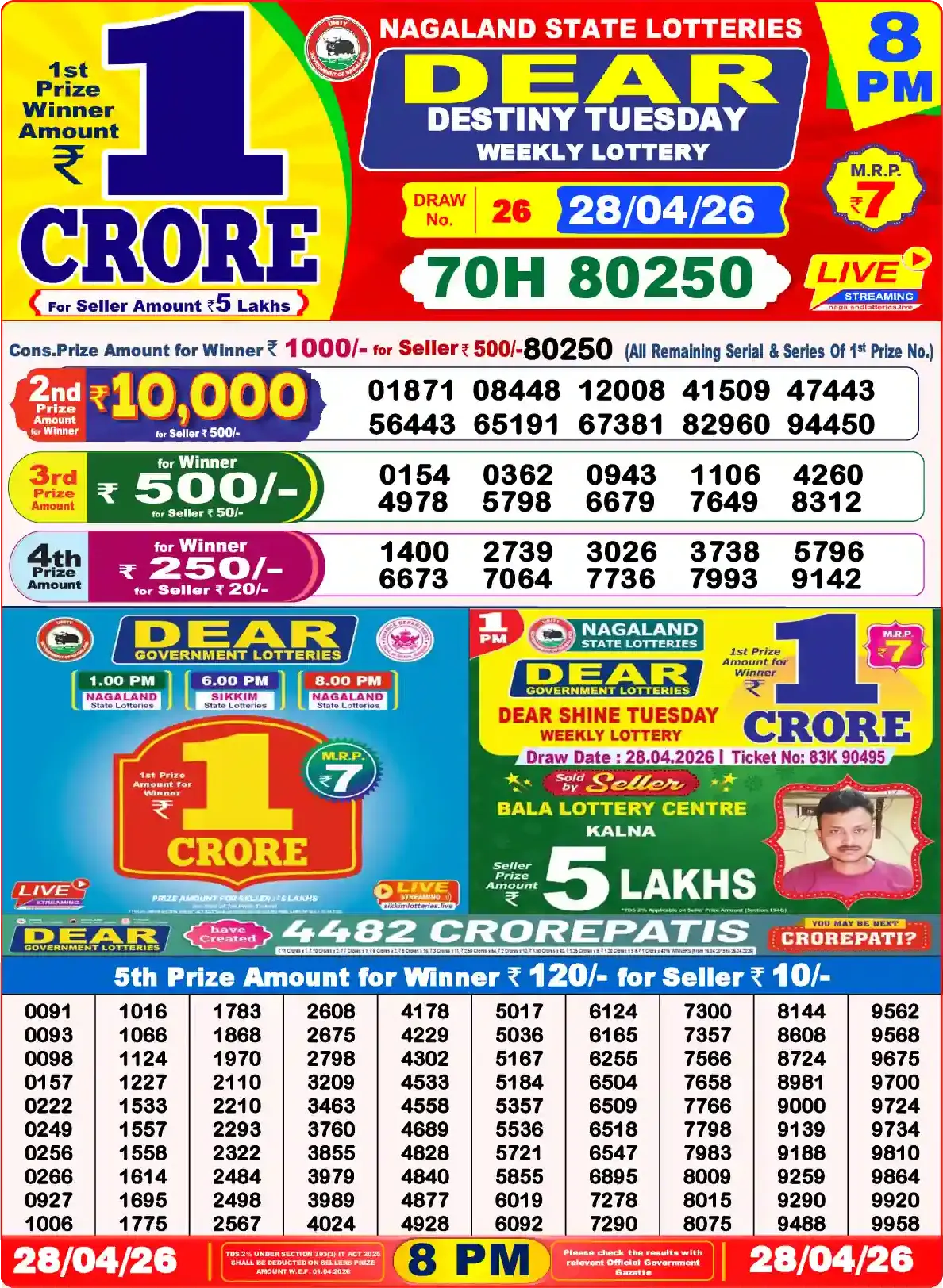 DEAR LOTTERYThe Nagaland Lottery Result will be announced yesterday 27/04/2026 at 8:00 p.m., and participants can check the winning numbers online on our website. The Nagaland State Lottery Sambad Today 8pm is the third of three daily draws.