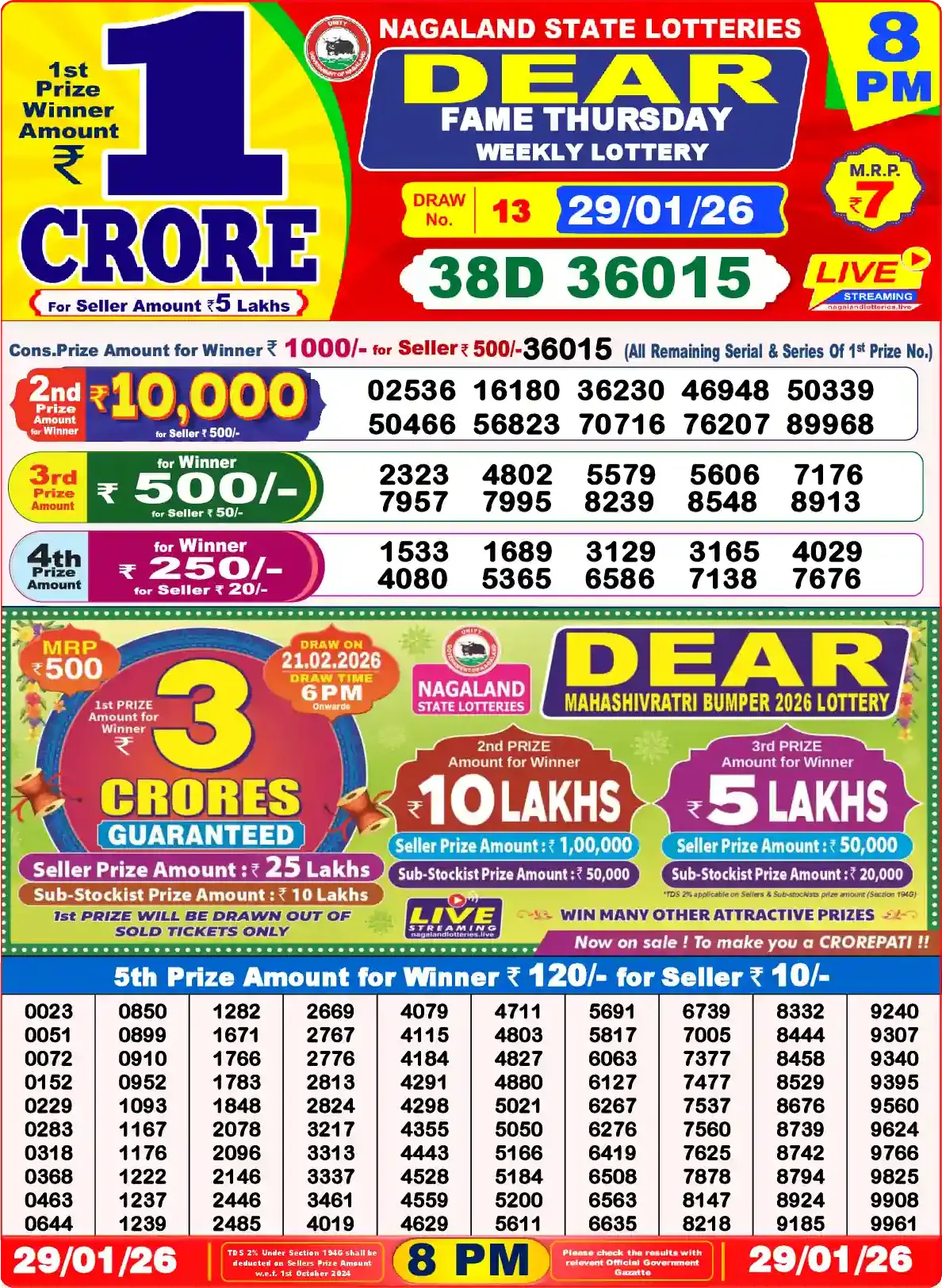 Dear Lottery results yesterday 29/01/2026 from the state of Nagaland at 8:00 p.m. View the Dear Lottery Result Today 8 PM on our website.