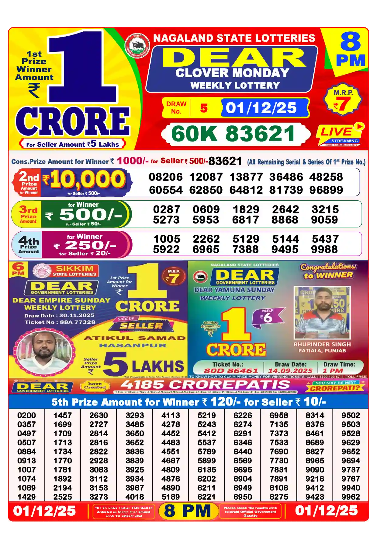 Dear Lottery results yesterday 01/12/2025 from the state of Nagaland at 8:00 p.m. View the Dear Lottery Result Today 8 PM on our website.