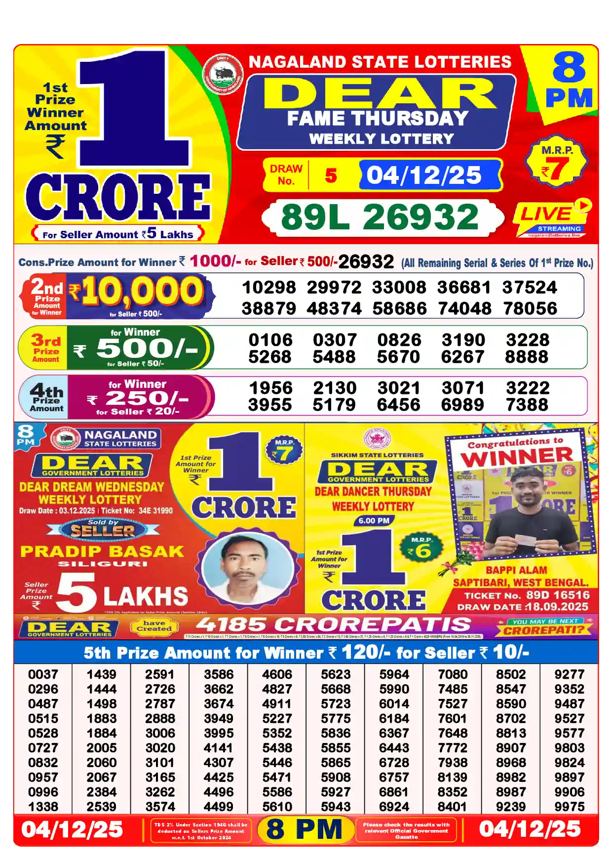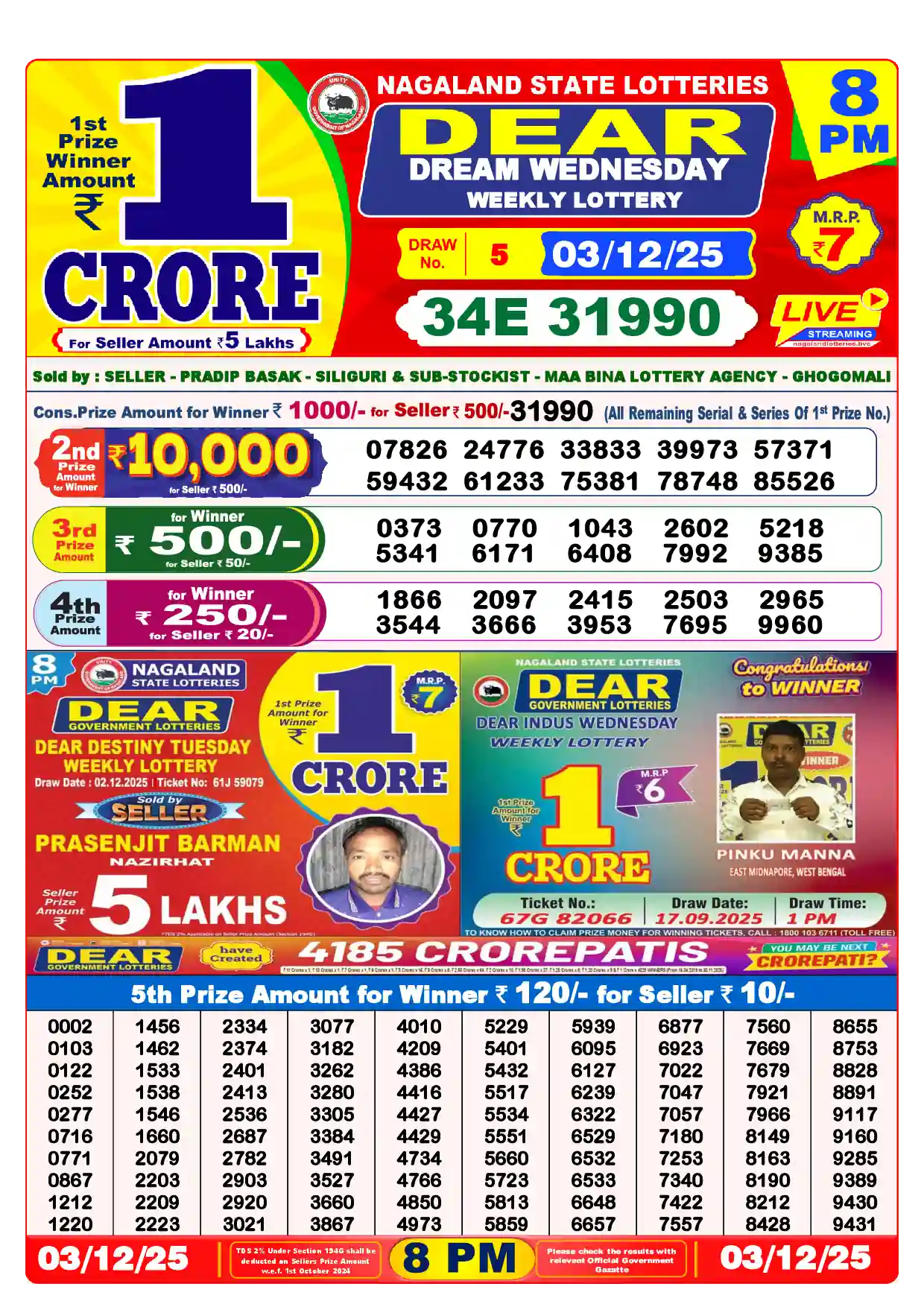 Dear Lottery results yesterday 03/12/2025 from the state of Nagaland at 8:00 p.m. View the Dear Lottery Result Today 8 PM on our website.