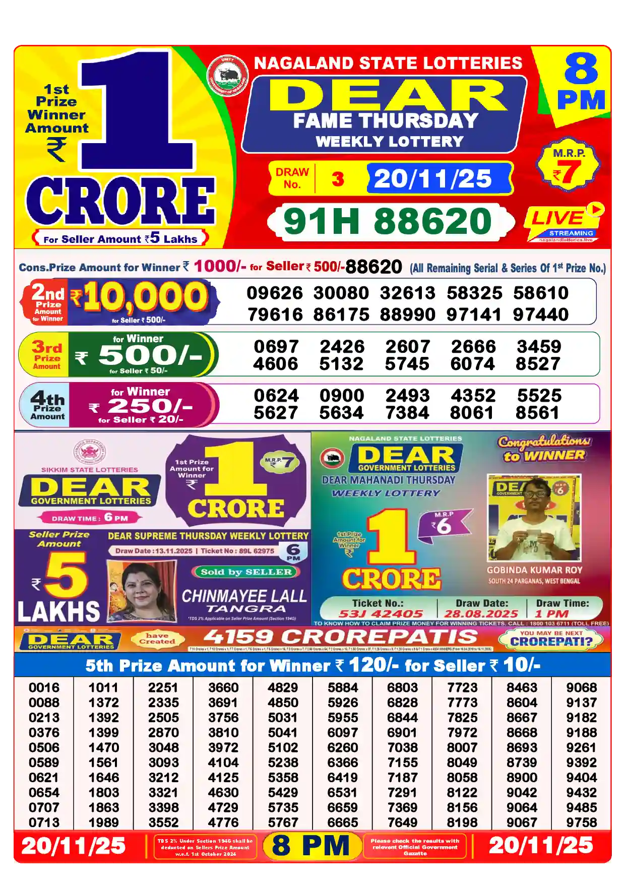 Dear Lottery results yesterday 20/11/2025 from the state of Nagaland at 8:00 p.m. View the Dear Lottery Result Today 8 PM on our website.