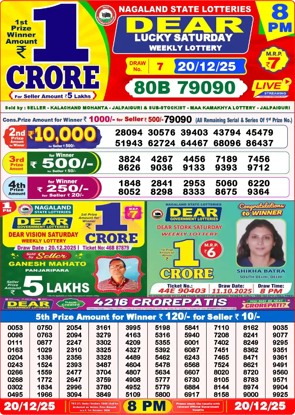 Dear Lottery results yesterday 20/12/2025 from the state of Nagaland at 8:00 p.m. View the Dear Lottery Result Today 8 PM on our website.