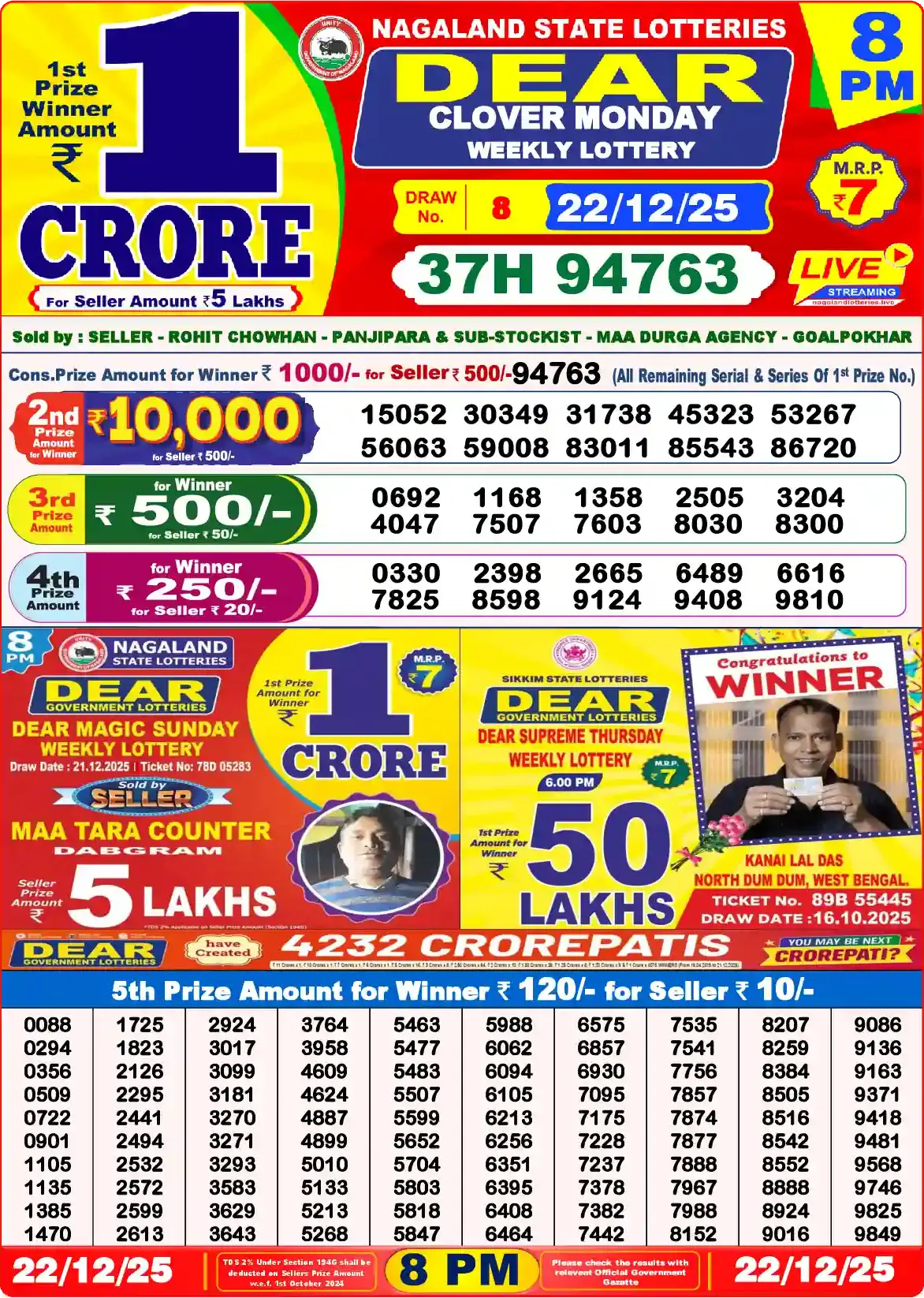 Dear Lottery results yesterday 22/12/2025 from the state of Nagaland at 8:00 p.m. View the Dear Lottery Result Today 8 PM on our website.