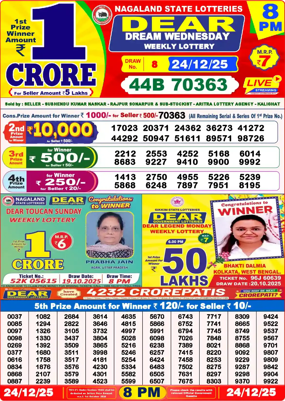 Dear Lottery results yesterday 24/12/2025 from the state of Nagaland at 8:00 p.m. View the Dear Lottery Result Today 8 PM on our website.