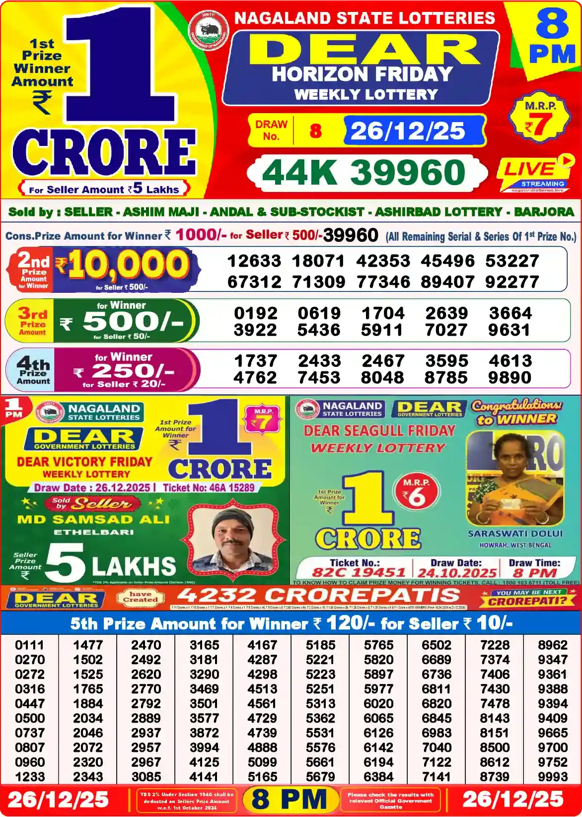 Dear Lottery results yesterday 26/12/2025 from the state of Nagaland at 8:00 p.m. View the Dear Lottery Result Today 8 PM on our website.