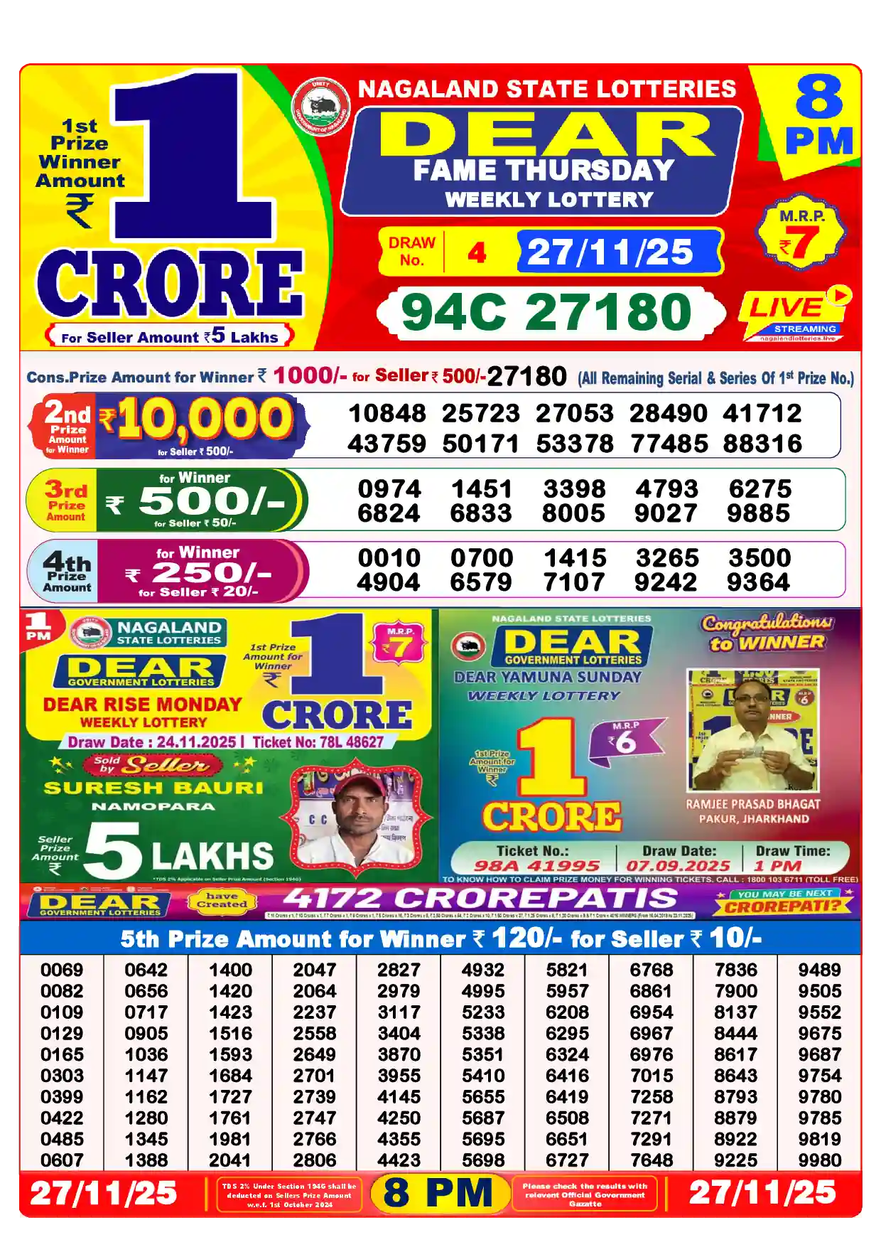 Dear Lottery results yesterday 27/11/2025 from the state of Nagaland at 8:00 p.m. View the Dear Lottery Result Today 8 PM on our website.