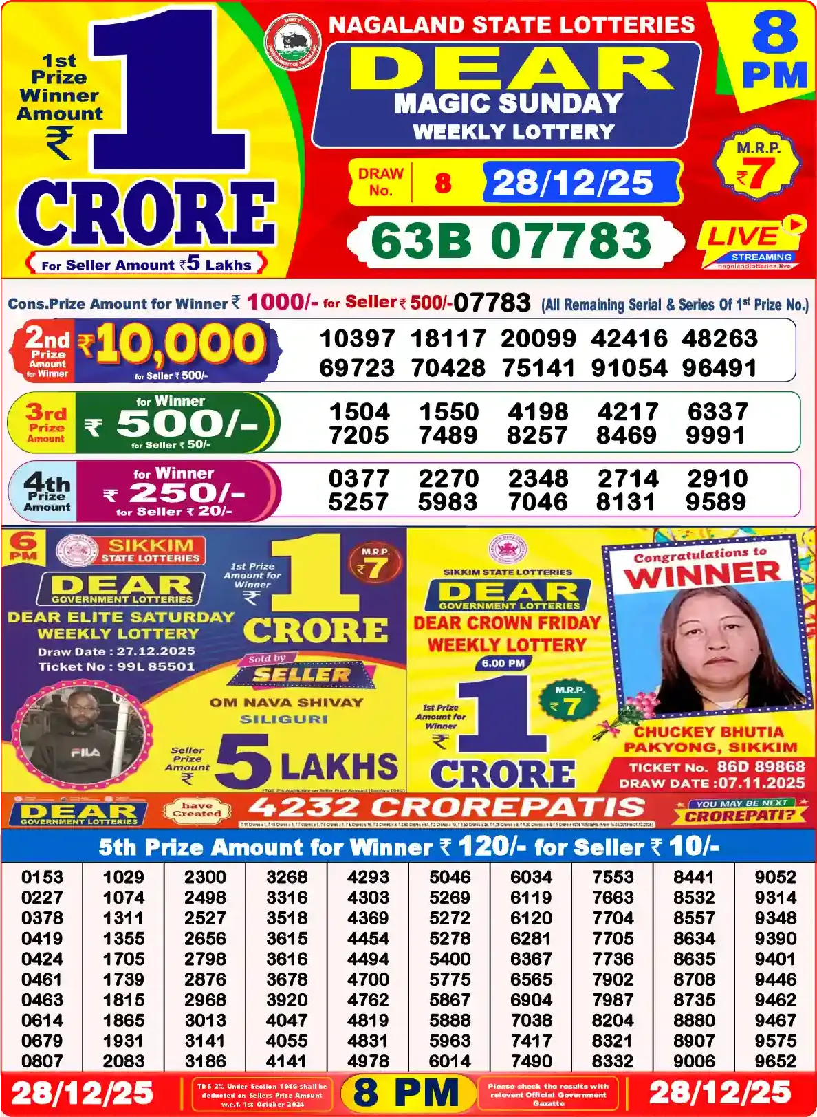 Dear Lottery results yesterday 28/12/2025 from the state of Nagaland at 8:00 p.m. View the Dear Lottery Result Today 8 PM on our website.