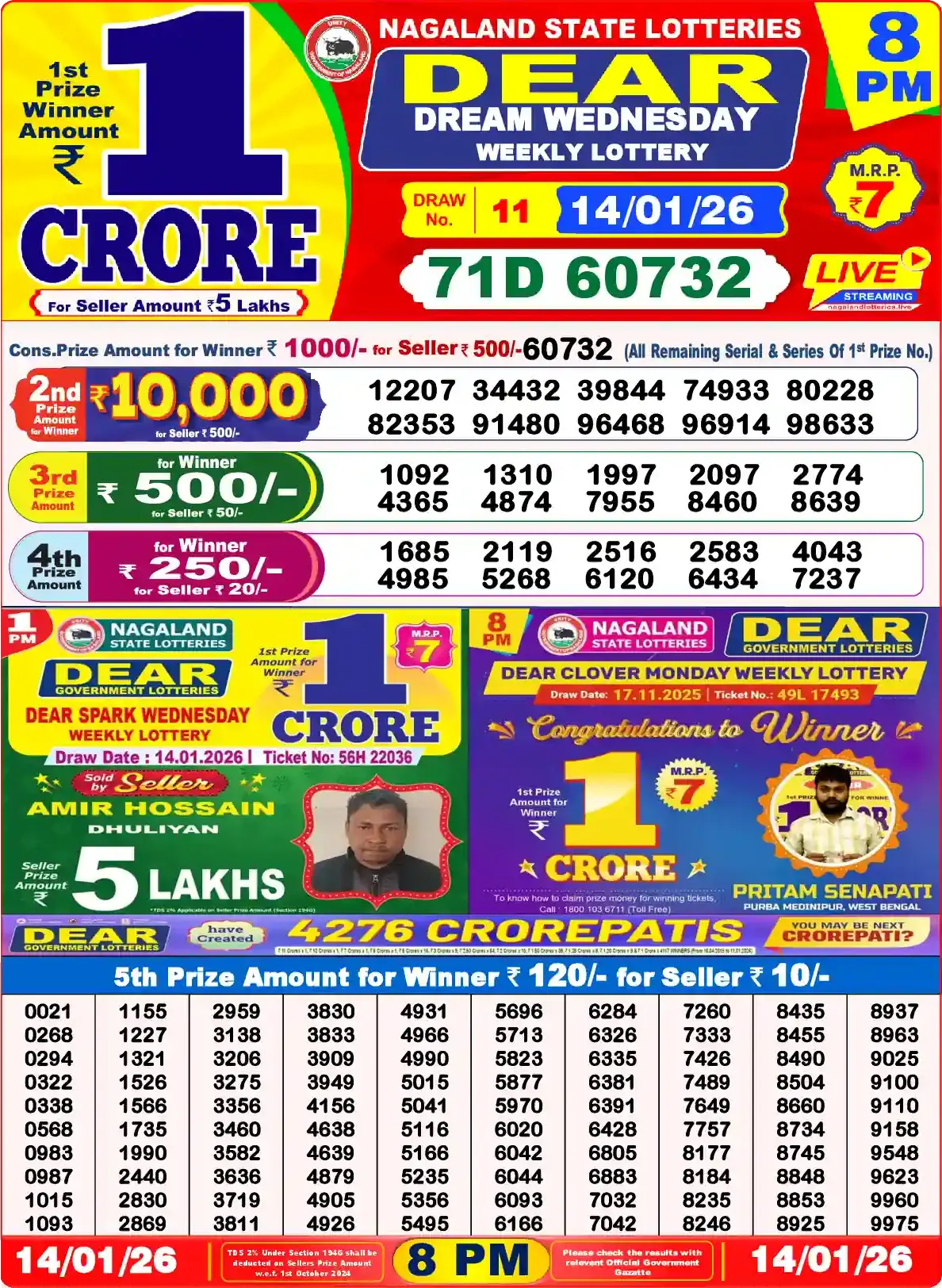 Dear Lottery results yesterday 14/01/2026 from the state of Nagaland at 8:00 p.m. View the Dear Lottery Result Today 8 PM on our website.