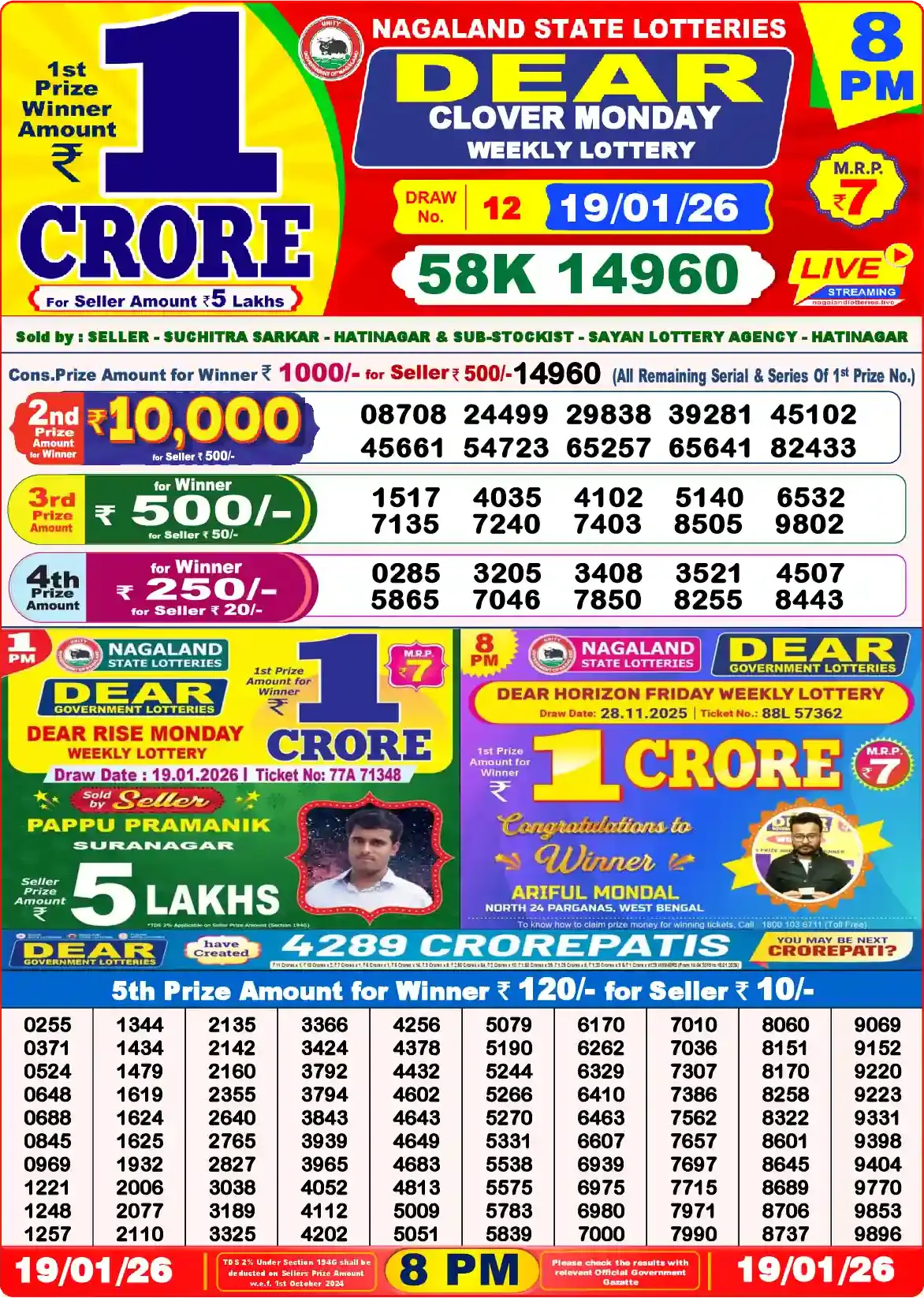 Dear Lottery results yesterday 19/01/2026 from the state of Nagaland at 8:00 p.m. View the Dear Lottery Result Today 8 PM on our website.