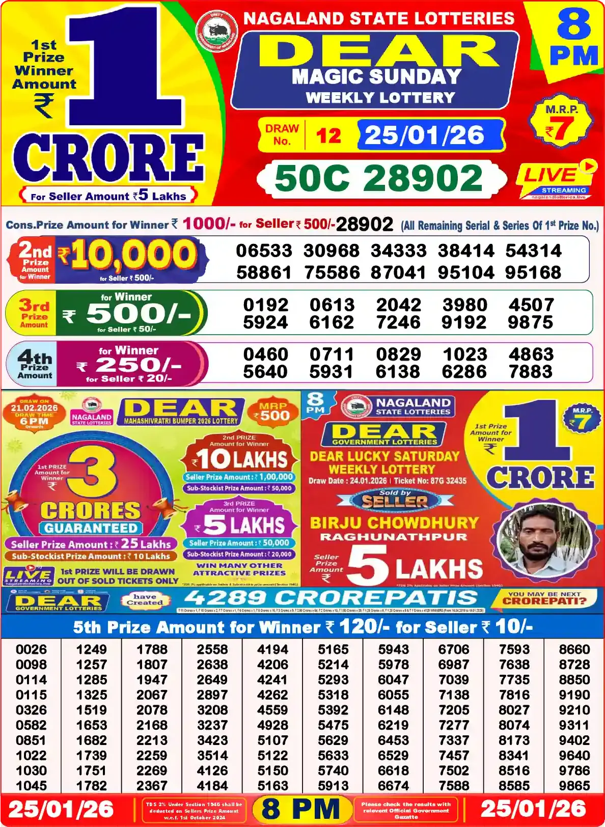 Dear Lottery results yesterday 25/01/2026 from the state of Nagaland at 8:00 p.m. View the Dear Lottery Result Today 8 PM on our website.